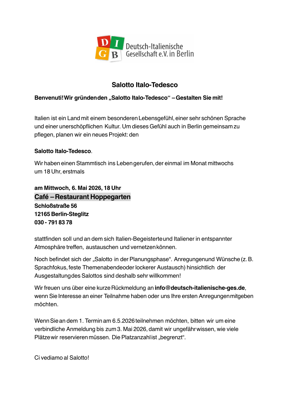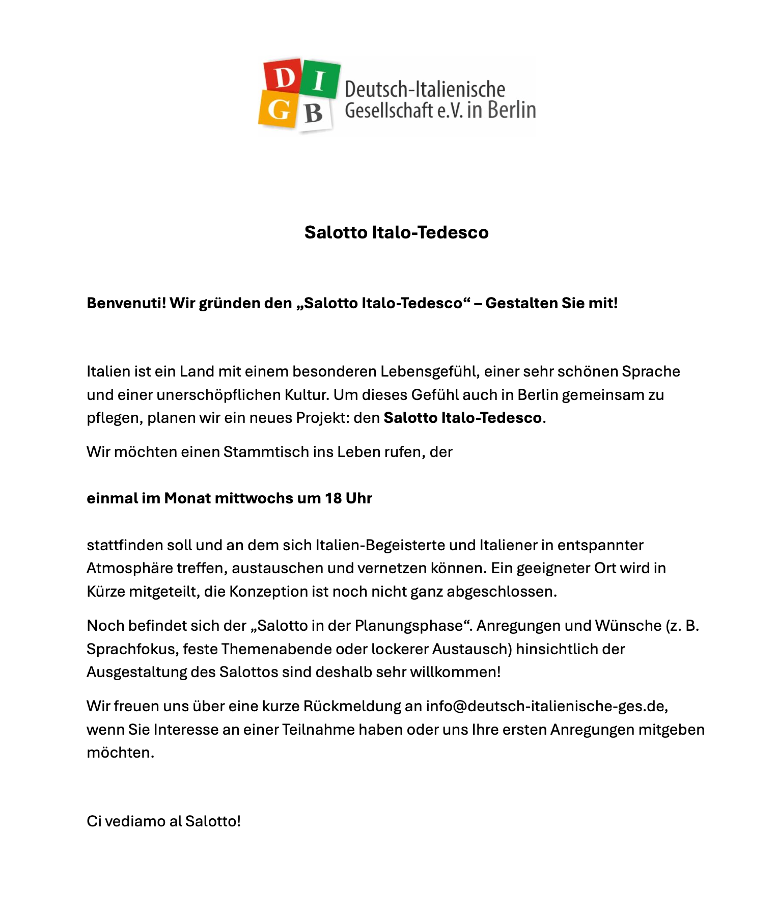 Die Deutsch-Italienische Gesellschaft (DIG) in Berlin wurde nach dem 2. Weltkrieg im Jahr 1950 wiedergegründet und verfolgt zwei übergeordnete Ziele: